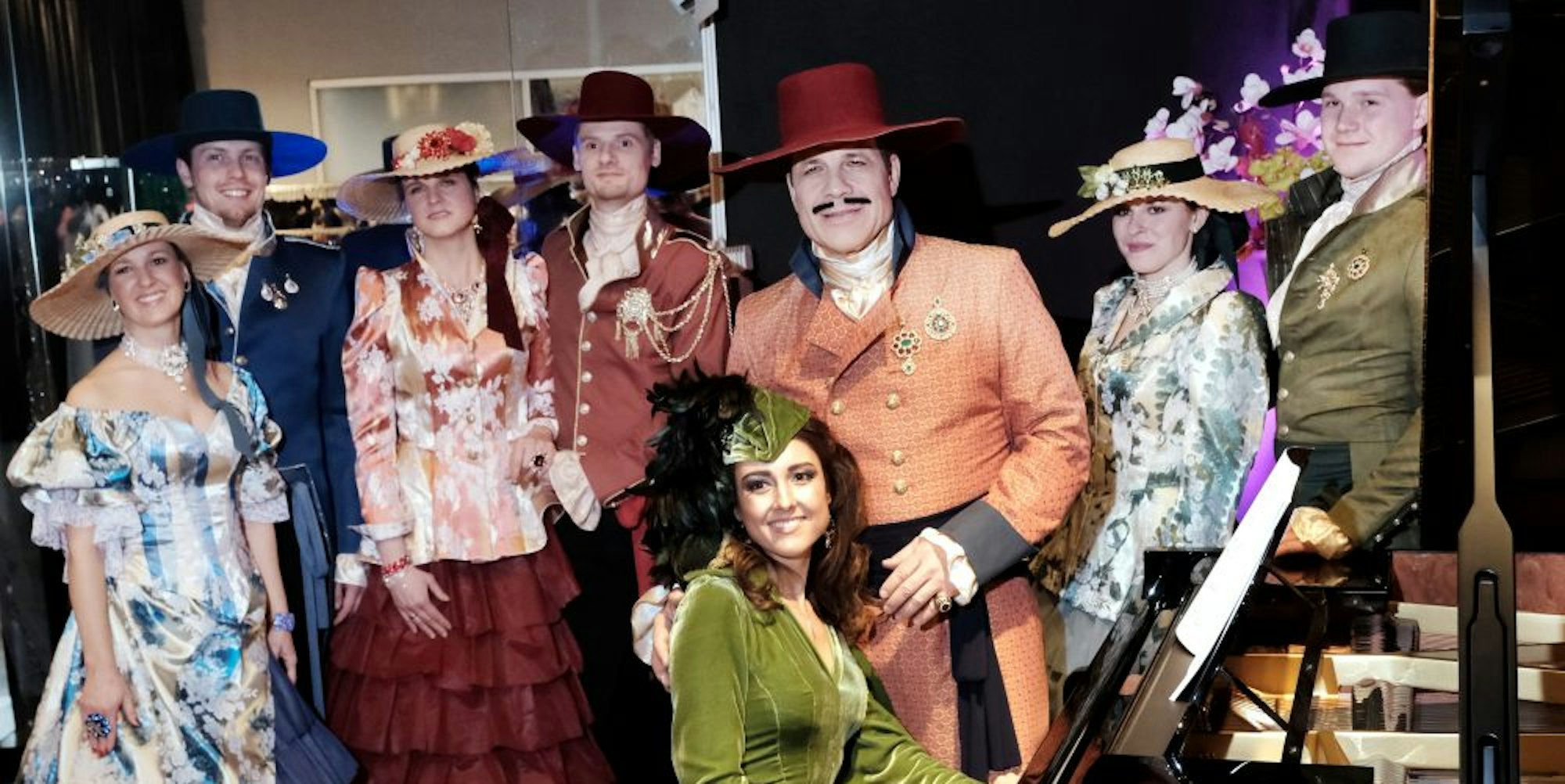 Für die Männer sind doppelreihige Gehröcke oder sogenannte Diplomaten-Fräcke vorgesehen und dazu breitkrempige Hüte; die Damen schlüpfen in Blusen mit Blumenmustern und einen Reifrock. „Damals hatte man ja Platz. Da hatten die Häuser auch Doppel-Flügeltüren“, weiß Schwope. „Gut, für den Kneipenkarneval ist das in der Form natürlich nichts.“ Aber da könne man die Reifen entfernen, dann habe man nur noch ein schmales Kleid.