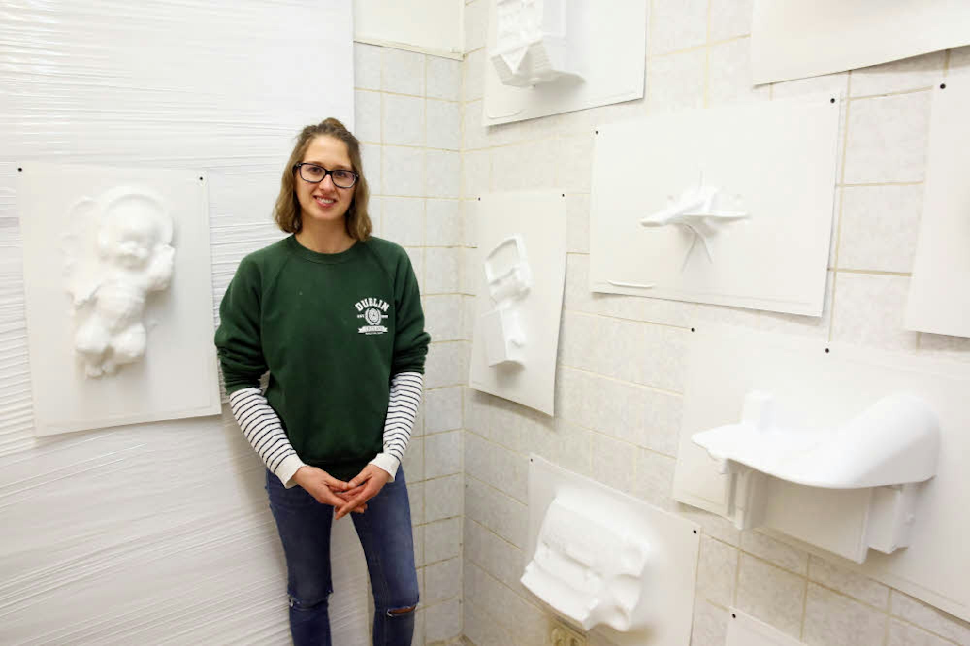 Zwischen ihren Abdrücken von alten Gebrauchsgegenständen und einem Baby: die Studentin Lena Pierzina von der FH Niederrhein.