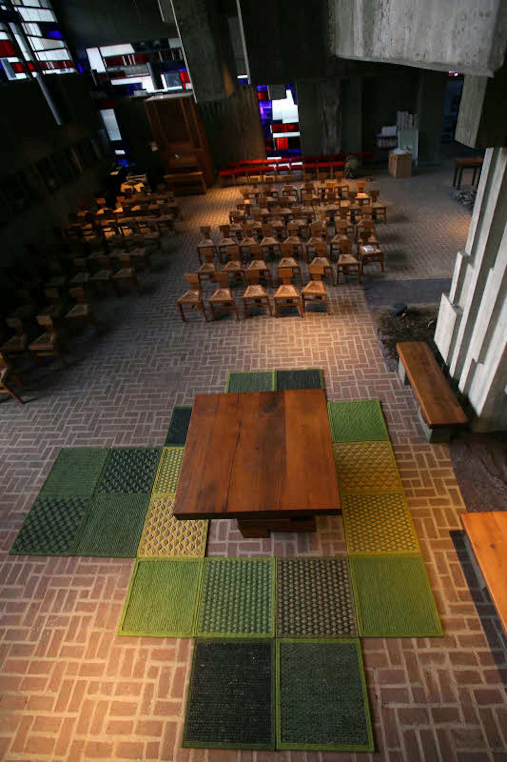 Eine weitere Kirche dürfte im Rahmen von Design/18/12 mit einem Highlight aufwarten: „Garten Eden 3.0“ nennt sich das Werk, das die Gartenmanufaktur Schmidt in der kubistisch anmutenden Betonarchitektur der Kirche Johannes XXIII. (Berrenrather Straße 127) installiert hat. Zugleich wird dort unter dem Motto „Wandeln auf wandelbarem Glück“ ein farbiges Mosaik aus zusammensteckbaren Schafwollteppich-Modulen zu sehen sein. Das Konzept stammt von dem schwedischen Floristen Per Benjamin.