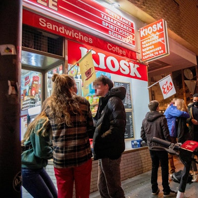Ein übliches Bild in Köln: Menschen stehen nachts vor einem Kiosk, wie hier am Brüsseler Platz.