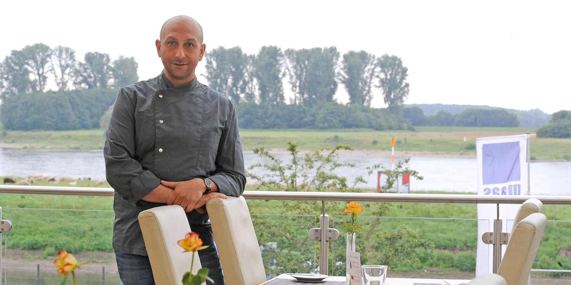 Von der Rheinstraße sticht das gläserne Dachgeschoss der Hausnummer 70 ins Auge. Oben angekommen bleibt der Blick aber nicht am Glas hängen, sondern alleine am Rhein, der sich dahinter in seiner ganzen Pracht entfaltet. Wenn die Sonne scheint, muss sich unter den großen Leinensegeln und toskanischen Wandgemälden unweigerlich ein Urlaubsgefühl einstellen. Darauf hat Christofero di Gregorio gesetzt, als er mit seinem gut laufenden Restaurant „Peperoncino“ vor drei Jahren aus Küppersteg nach Hitdorf gezogen ist.