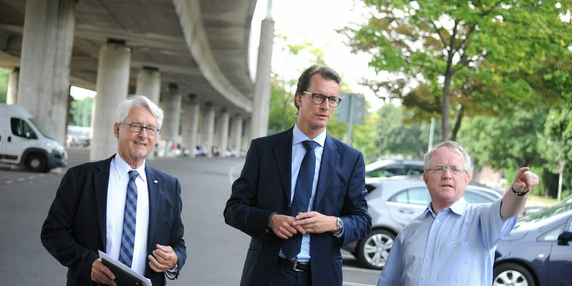 Landesverkehrsminister Hendrik Wüst (Mitte) besichtigte gestern mit Helmut Nowak (links) und dem Landtagsabgeordneten Rüdiger Scholz die Stelzenautobahn in Küppersteg.