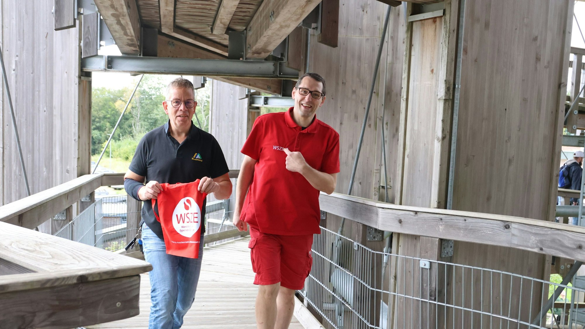 Während Konrad damals zwölf Stunden lang gelaufen war, ging es jetzt nur um einen einzigen Auf- und Abstieg. Eine Herausforderung, der sich Parkführer Patrick Mielke gerne stellte. Am Ende kam er ein paar Zentimeter vor Konrad ins Ziel und erklärte seinen Trick: „Ich bin extra auf der Innenbahn gelaufen.“