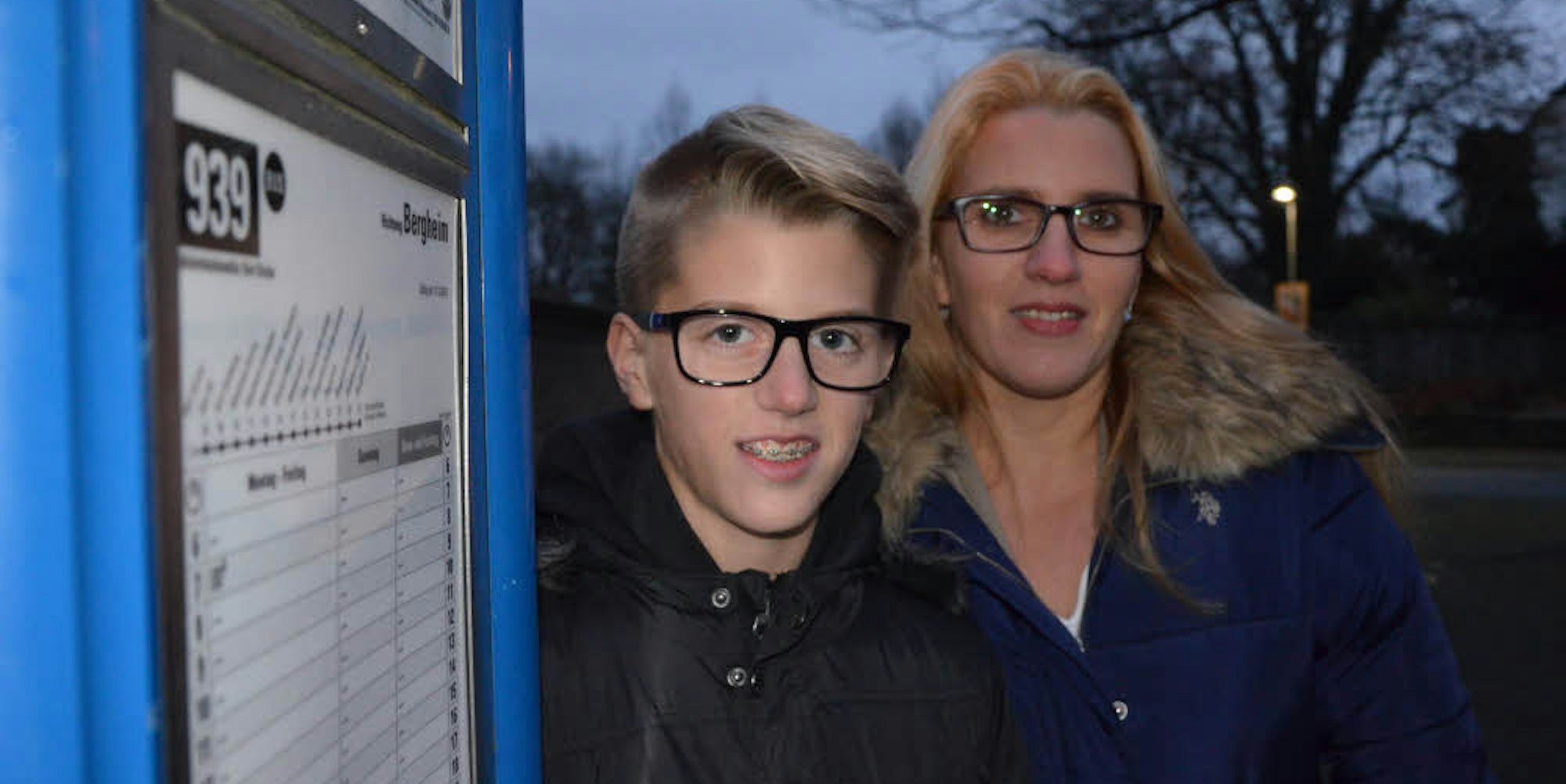 Unzumutbar finden Regina Mengwasser und ihr Sohn Max (12) den kommenden Wegfall der Buslinie 939 zwischen Buir und Bergheim, wo der Sohn das Gymnasium besucht.