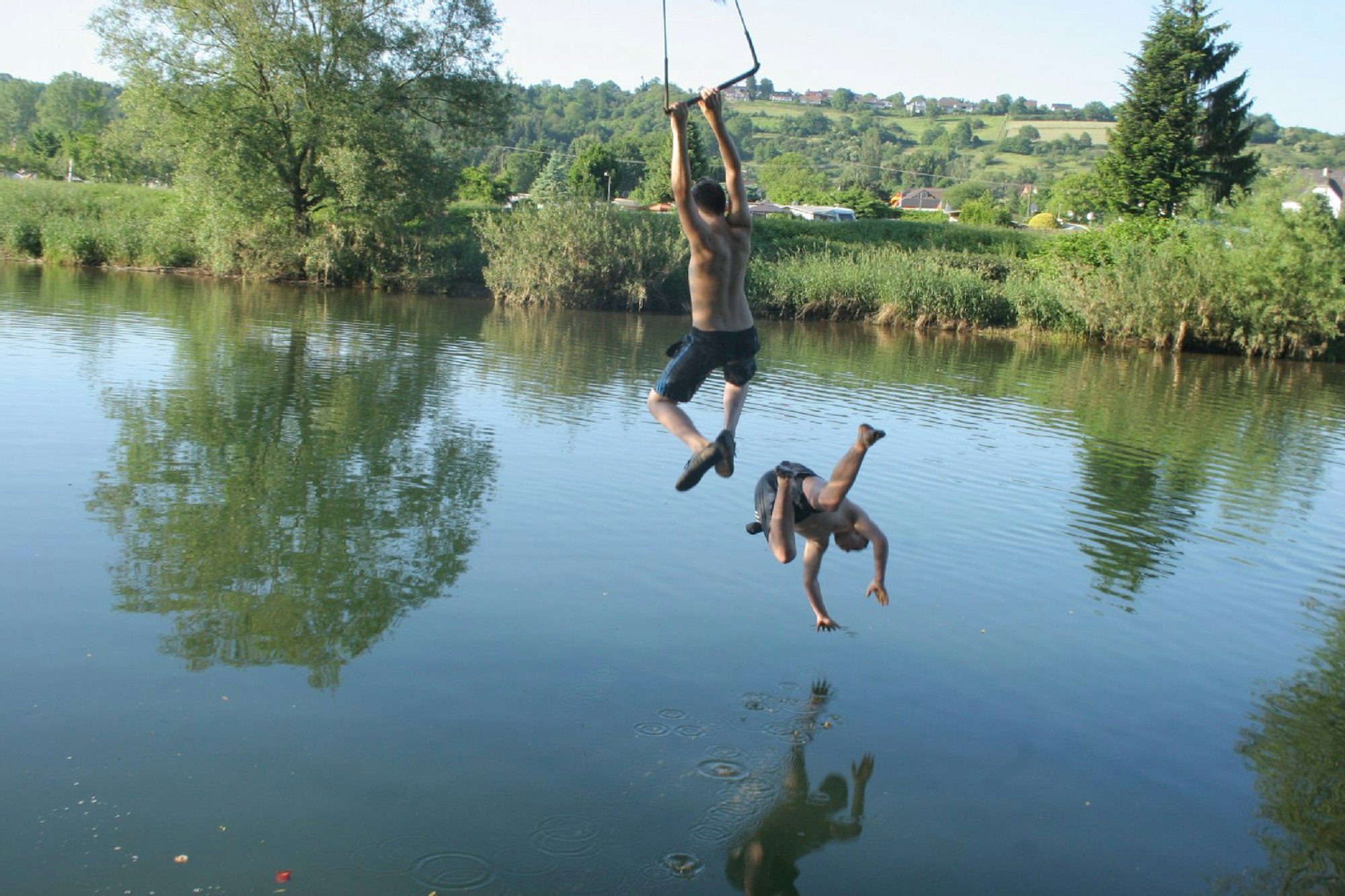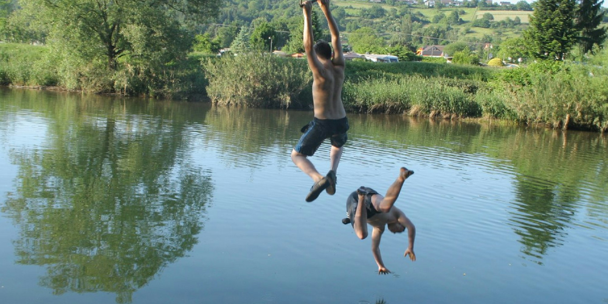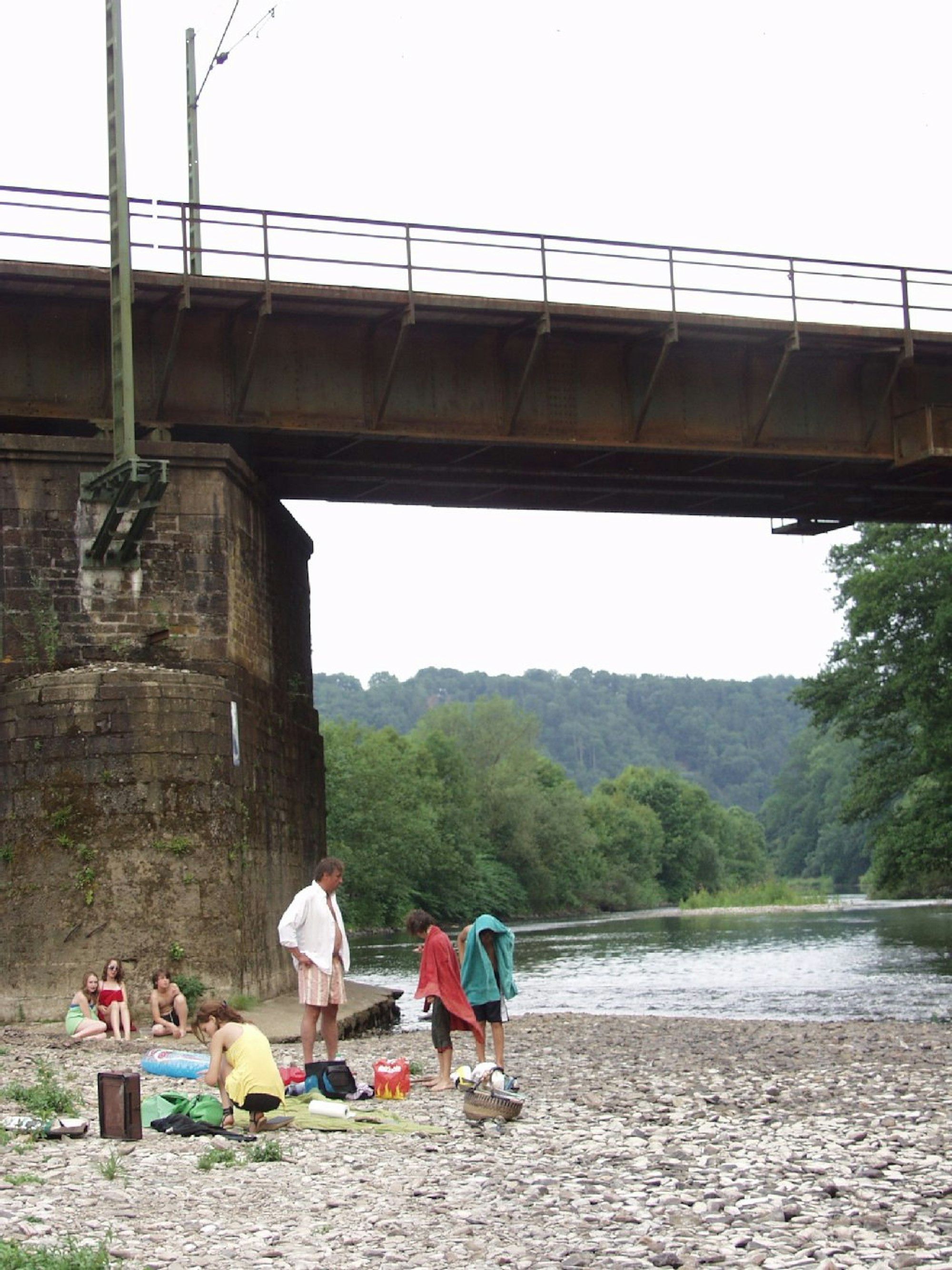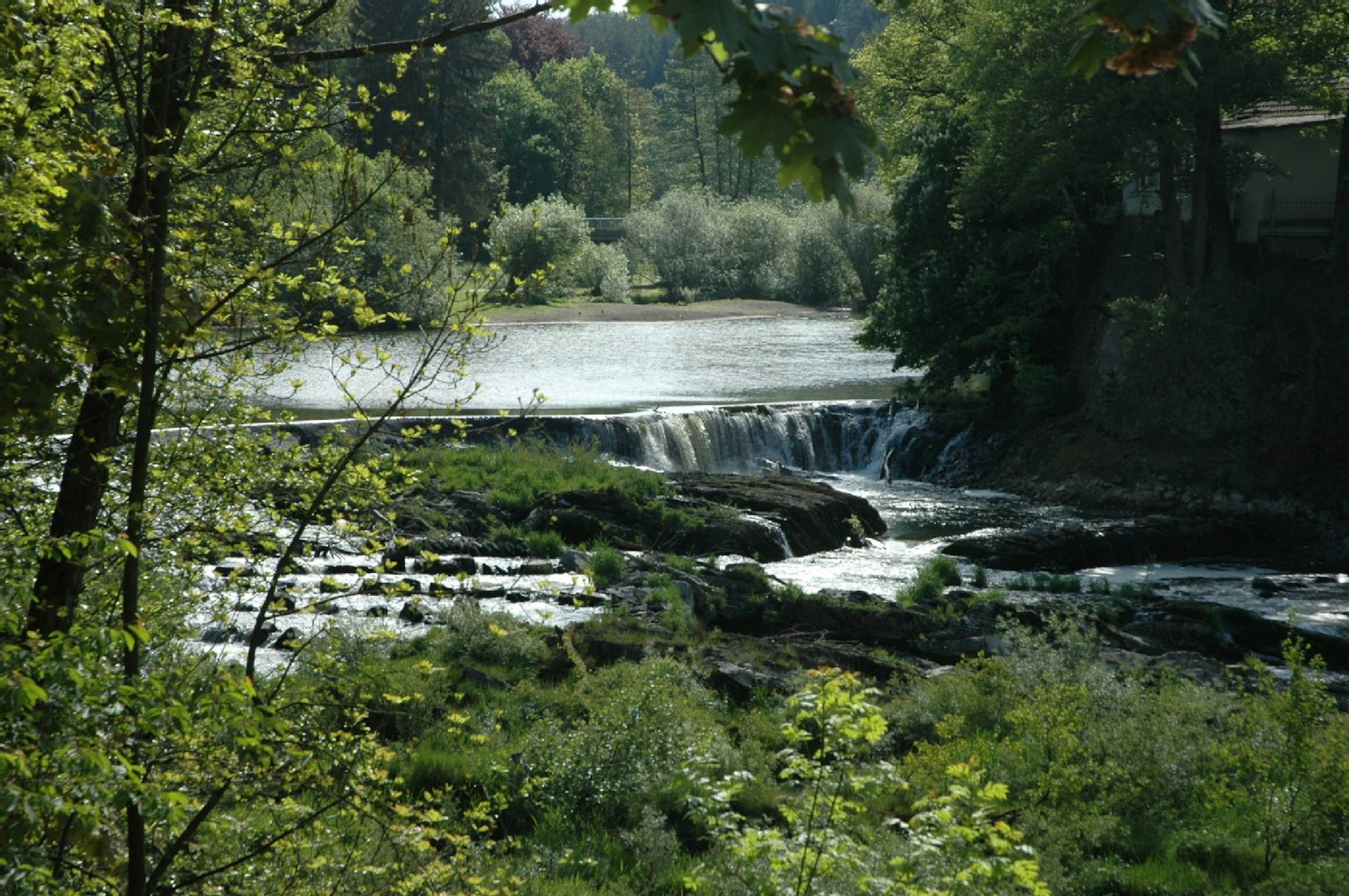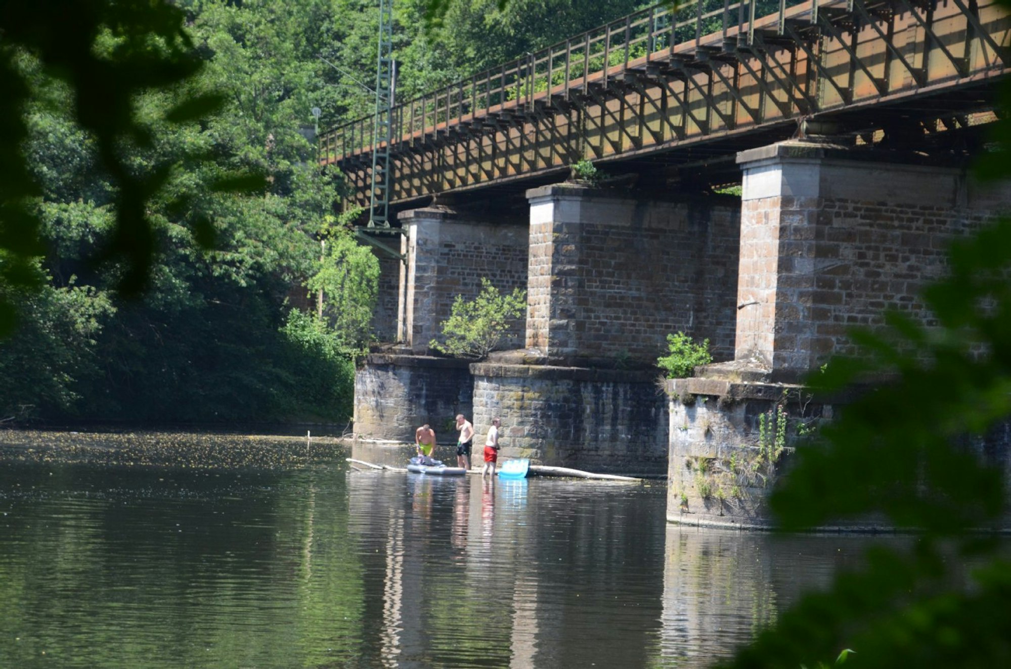 Zwischen einer Eisenbahn- und einer schmalen Autobrücke reihen sich oberhalb des Schladerner Wasserfalles gleich mehrere Badestellen aneinander.