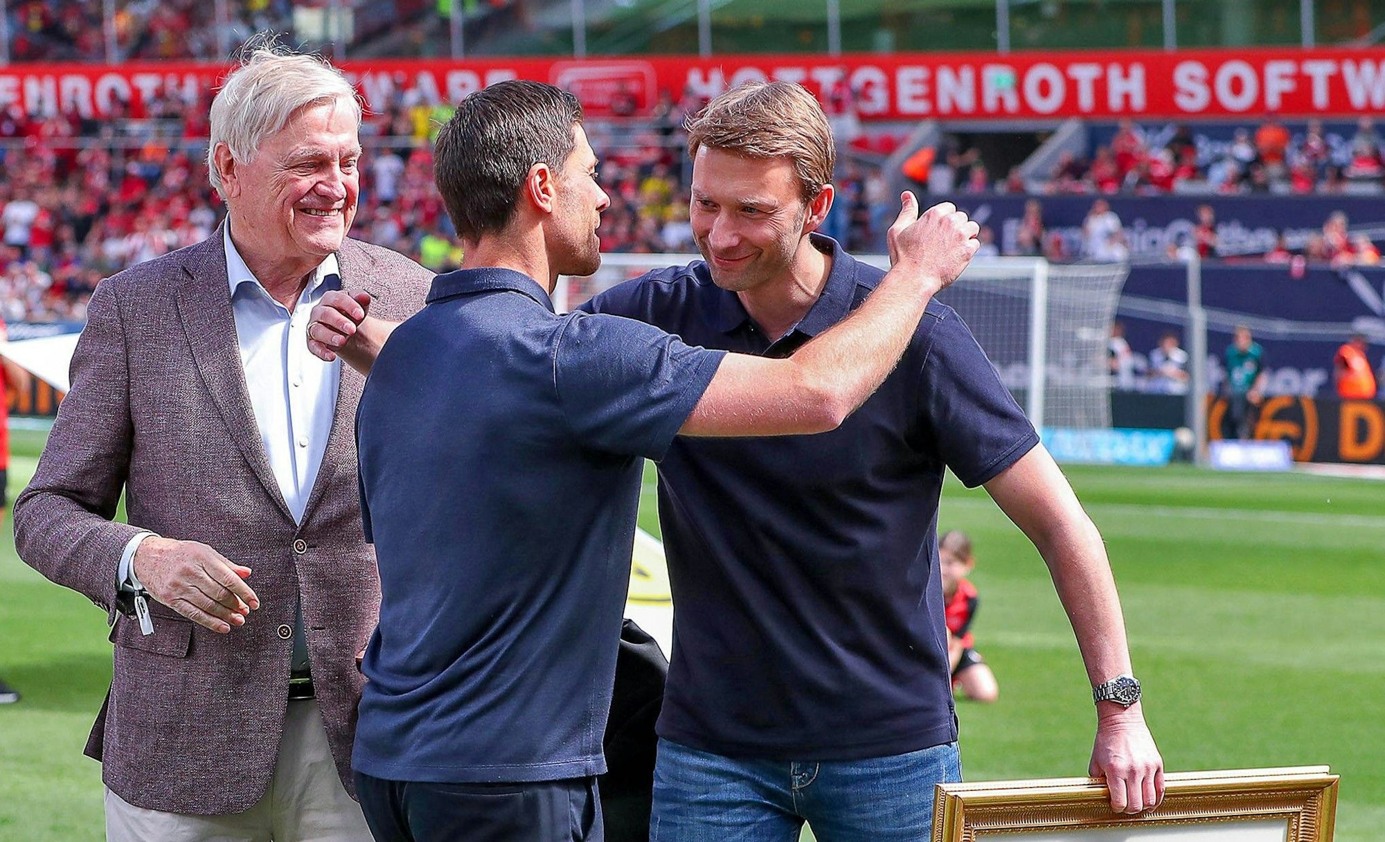 Simon Rolfes, der Vorsitzende der Geschäftsführung, Fernando Carro, und Werner Wenning mit der Meisterschale 2024.