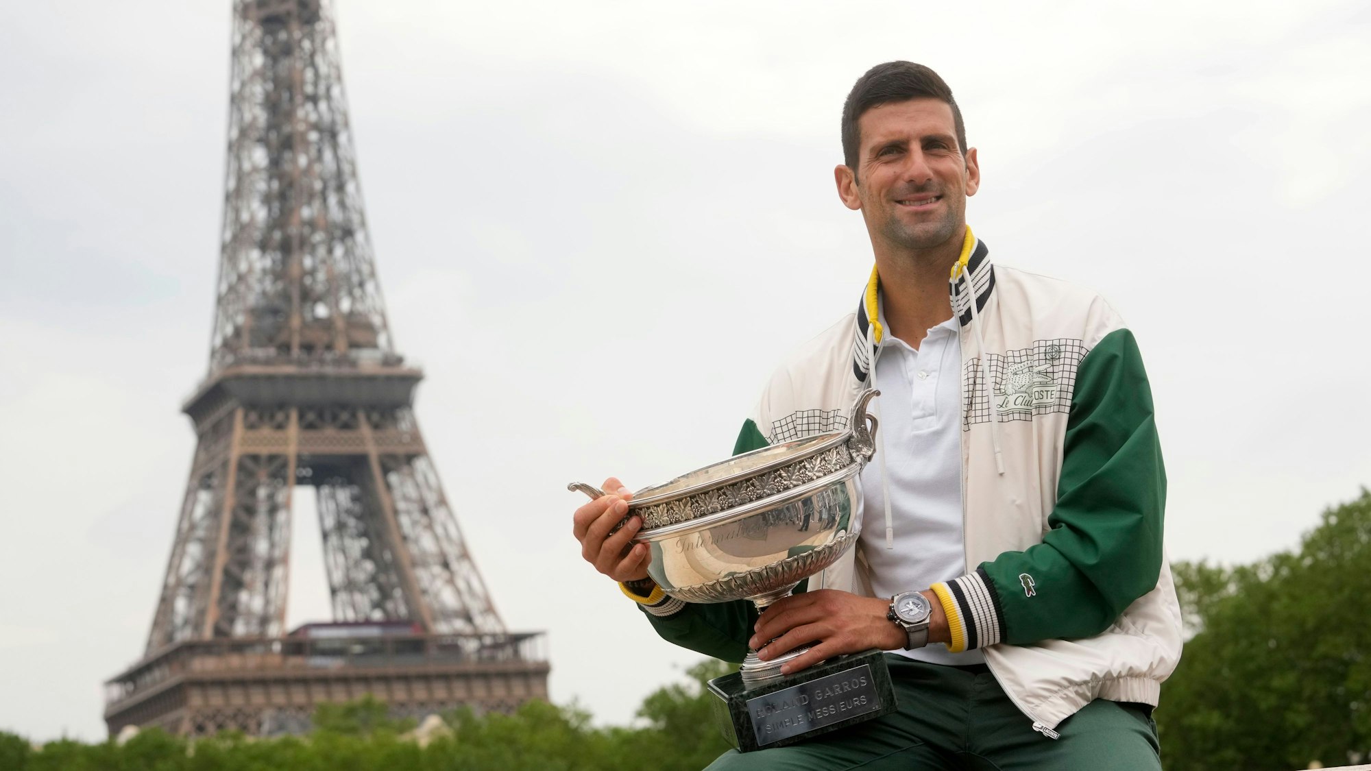 Novak Djokovic präsentiert die Trophäe vor dem Eiffelturm